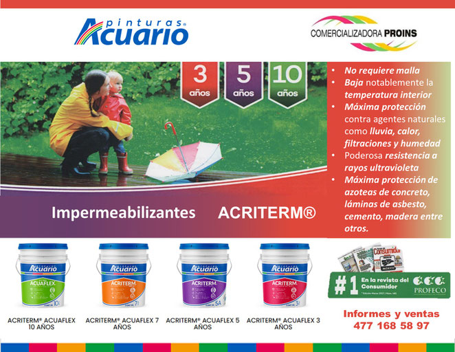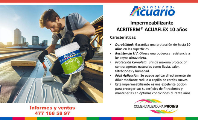 Dentro de la gama de IMPERMEABILIZANTES de ACUARIO, tenemos a su disposición el impermeabilizante Acriterm ACUAFLEX. Este Impermeabilizante elastomérico está fabricado a base de resinas estiren-acrílicas y materias primas de la más alta calidad, formulado para proteger azoteas de concreto, cemento, muros, madera, etc. con una duración mínima garantizada de 7 años.