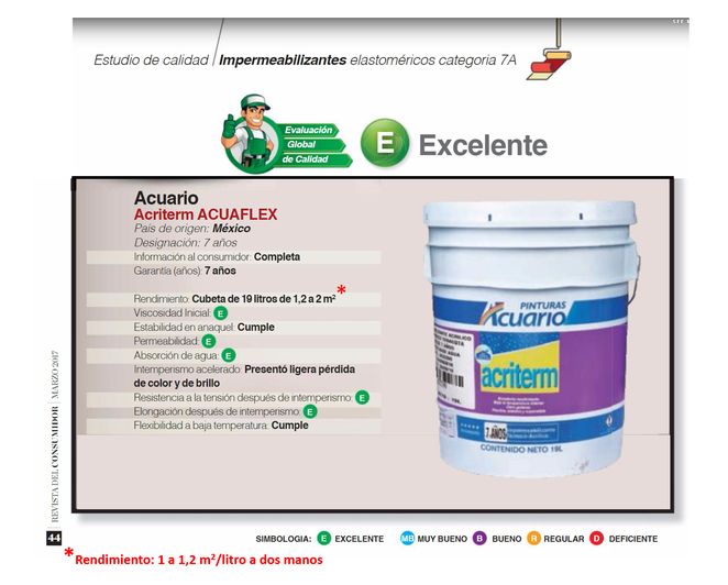 De acuerdo a la Revista del Consumidor en su edición No. 481 (marzo 2017), en donde presenta el análisis de calidad de 16 impermeabilizantes elastoméricos categoría 7-A de mayor distribución en el país, realizado en el Laboratorio Nacional de Protección al Consumidor y así apoyar a los consumidores en su mejor decisión de compra, cataloga a este impermeabilizante como el mejor en el mercado.